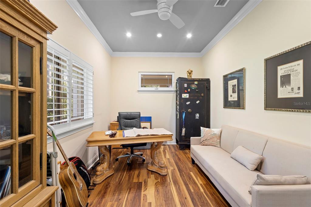 Built-in Features, Ceiling Fan(s), Chair Rail, Crown Molding, High Ceilings, Kitchen/Family Room Combo, Living Room/Dining Room Combo, Open Floorplan, Primary Bedroom Main Floor, Skylight(s), Solid Surface Counters, Stone Counters, Thermostat, Walk-In Closet(s), Window Treatments