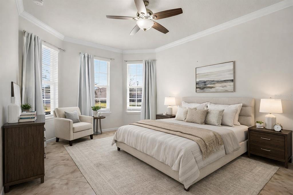 Ceiling Fan(s), Crown Molding, Eating Space In Kitchen, High Ceilings, Kitchen/Family Room Combo, Open Floorplan, Primary Bedroom Main Floor, Solid Wood Cabinets, Split Bedroom, Stone Counters, Thermostat, Walk-In Closet(s)