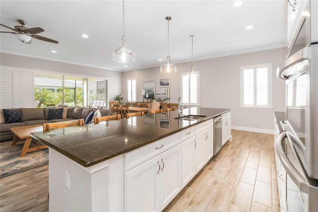 Built-in Features, Ceiling Fan(s), Eating Space In Kitchen, High Ceilings, Kitchen/Family Room Combo, Open Floorplan, Split Bedroom, Stone Counters, Thermostat, Tray Ceiling(s), Walk-In Closet(s), Window Treatments