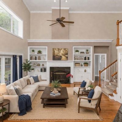 Built-in Features, Ceiling Fan(s), Chair Rail, Crown Molding, Eating Space In Kitchen, High Ceilings, Open Floorplan, Primary Bedroom Main Floor, Solid Surface Counters, Solid Wood Cabinets, Split Bedroom, Stone Counters, Thermostat, Walk-In Closet(s), Window Treatments