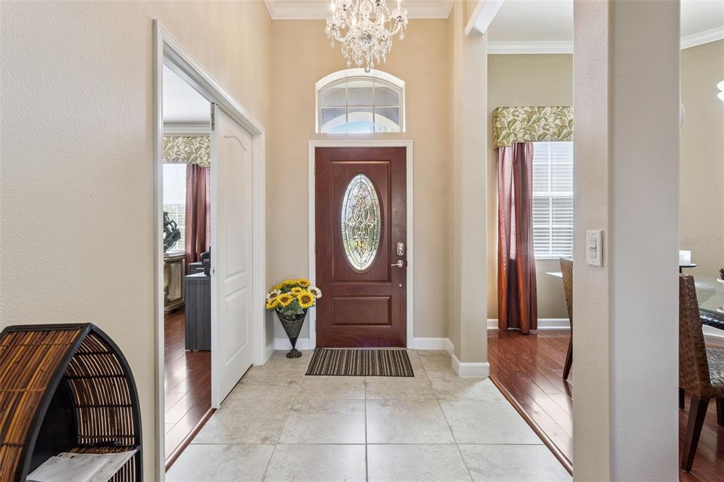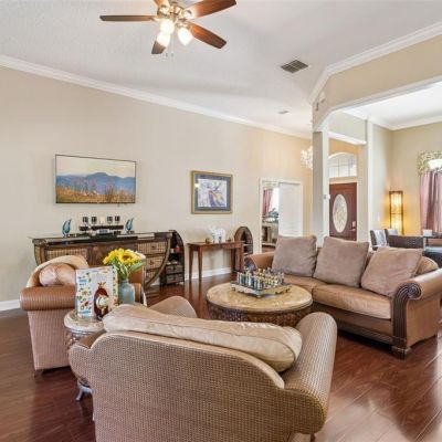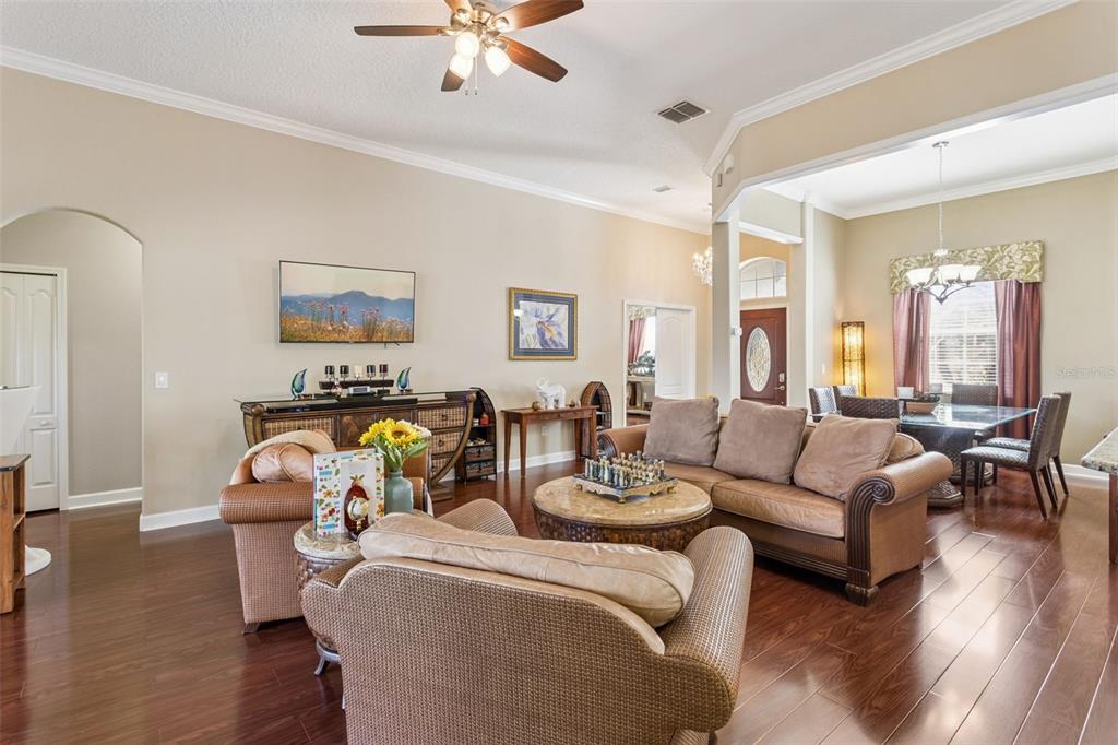 Ceiling Fan(s), Crown Molding, Eating Space In Kitchen, High Ceilings, Kitchen/Family Room Combo, Open Floorplan, Primary Bedroom Main Floor, Split Bedroom, Stone Counters, Thermostat, Tray Ceiling(s), Walk-In Closet(s)