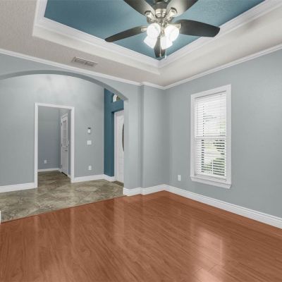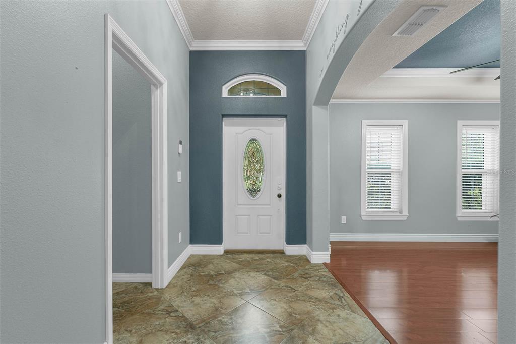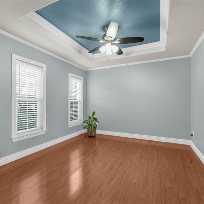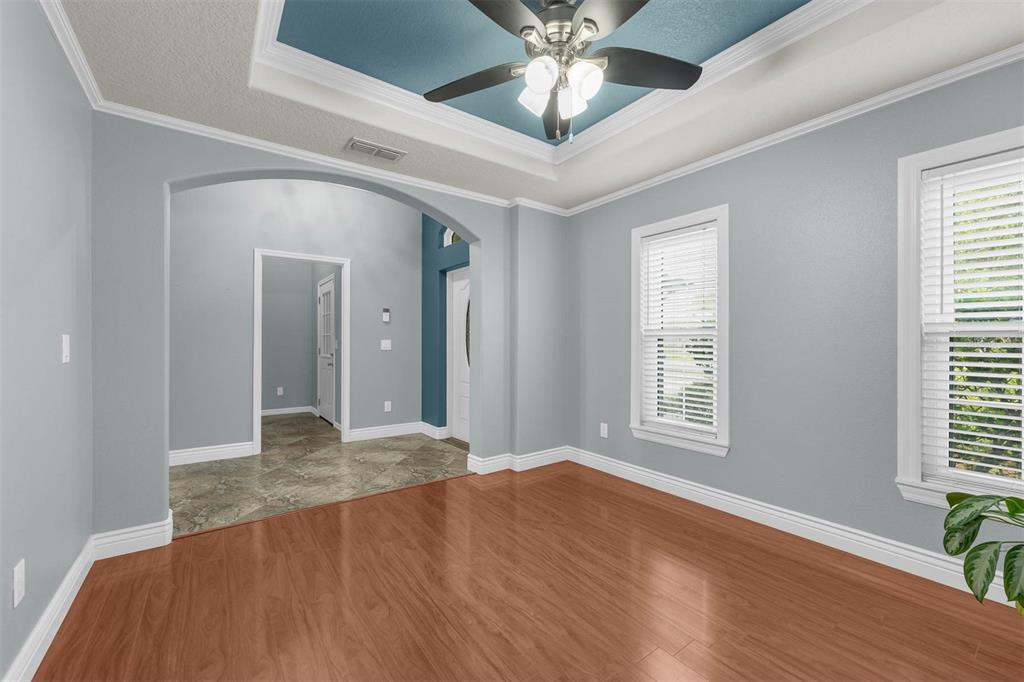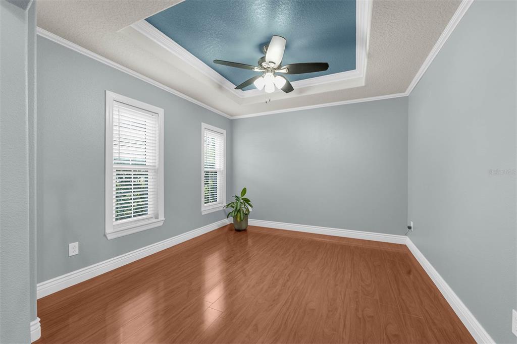 Ceiling Fan(s), Crown Molding, Open Floorplan, Primary Bedroom Main Floor, Solid Surface Counters, Split Bedroom, Thermostat