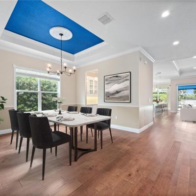 Ceiling Fan(s), Crown Molding, Eating Space In Kitchen, High Ceilings, Kitchen/Family Room Combo, Open Floorplan, Primary Bedroom Main Floor, Solid Wood Cabinets, Split Bedroom, Stone Counters, Tray Ceiling(s), Walk-In Closet(s), Window Treatments