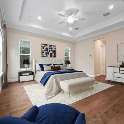 Ceiling Fan(s), Crown Molding, Eating Space In Kitchen, High Ceilings, Kitchen/Family Room Combo, Open Floorplan, Primary Bedroom Main Floor, Solid Wood Cabinets, Split Bedroom, Stone Counters, Tray Ceiling(s), Walk-In Closet(s), Window Treatments