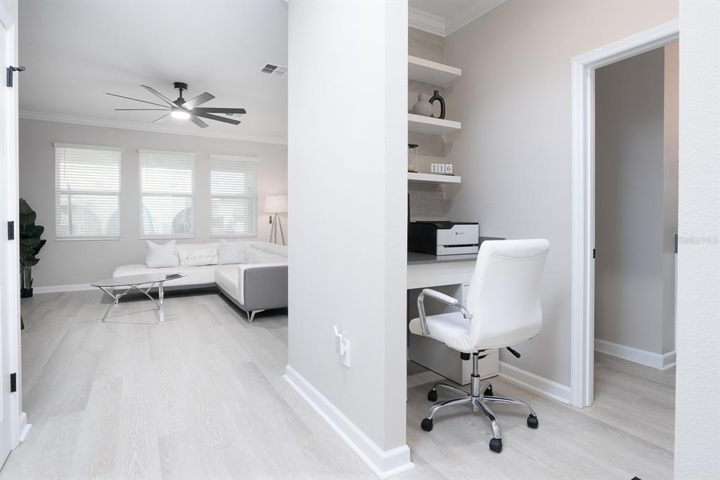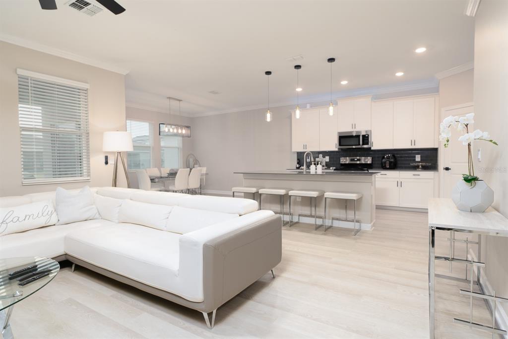 Ceiling Fan(s), Crown Molding, Eating Space In Kitchen, High Ceilings, Kitchen/Family Room Combo, Open Floorplan, PrimaryBedroom Upstairs, Smart Home, Solid Wood Cabinets, Split Bedroom, Stone Counters, Thermostat, Walk-In Closet(s), Window Treatments