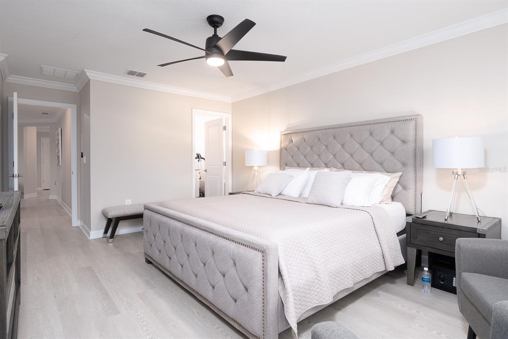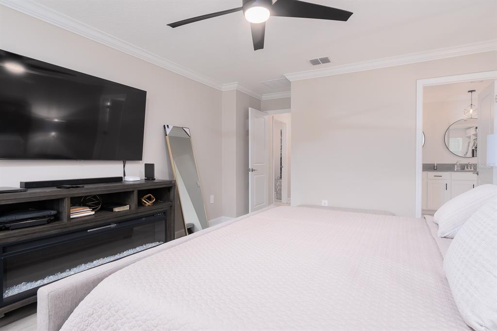 Ceiling Fan(s), Crown Molding, Eating Space In Kitchen, High Ceilings, Kitchen/Family Room Combo, Open Floorplan, PrimaryBedroom Upstairs, Smart Home, Solid Wood Cabinets, Split Bedroom, Stone Counters, Thermostat, Walk-In Closet(s), Window Treatments