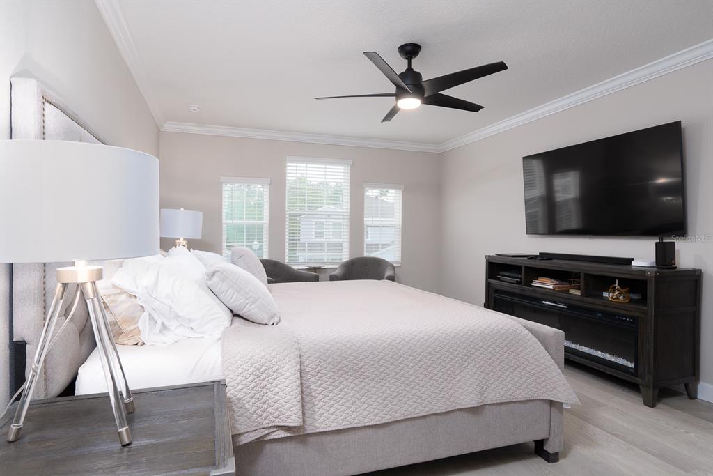 Ceiling Fan(s), Crown Molding, Eating Space In Kitchen, High Ceilings, Kitchen/Family Room Combo, Open Floorplan, PrimaryBedroom Upstairs, Smart Home, Solid Wood Cabinets, Split Bedroom, Stone Counters, Thermostat, Walk-In Closet(s), Window Treatments