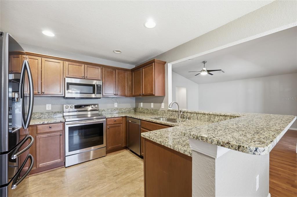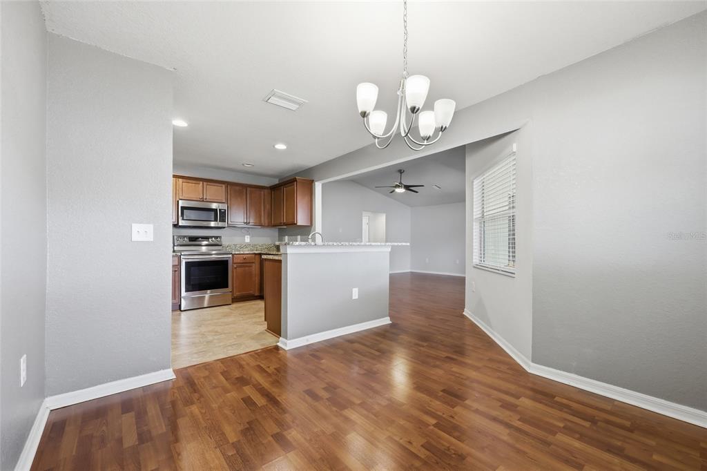 Eating Space In Kitchen, Stone Counters, Vaulted Ceiling(s), Window Treatments
