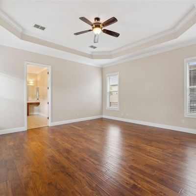 Ceiling Fan(s), Chair Rail, Coffered Ceiling(s), Crown Molding, High Ceilings, Kitchen/Family Room Combo, Open Floorplan, Primary Bedroom Main Floor, Solid Wood Cabinets, Split Bedroom, Stone Counters, Thermostat, Tray Ceiling(s), Walk-In Closet(s), Window Treatments