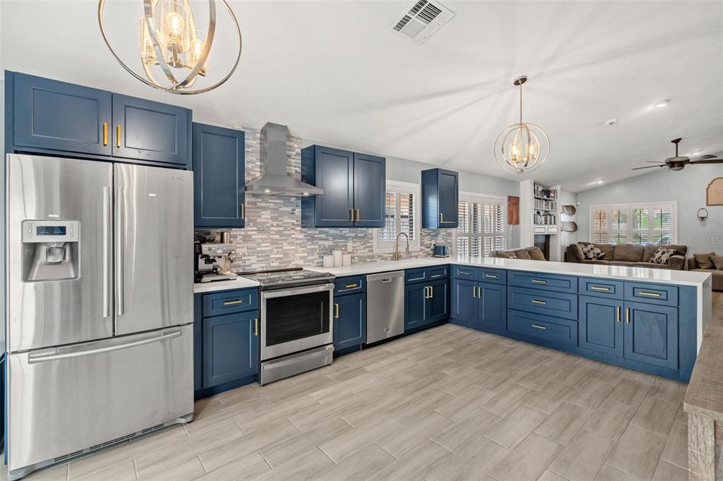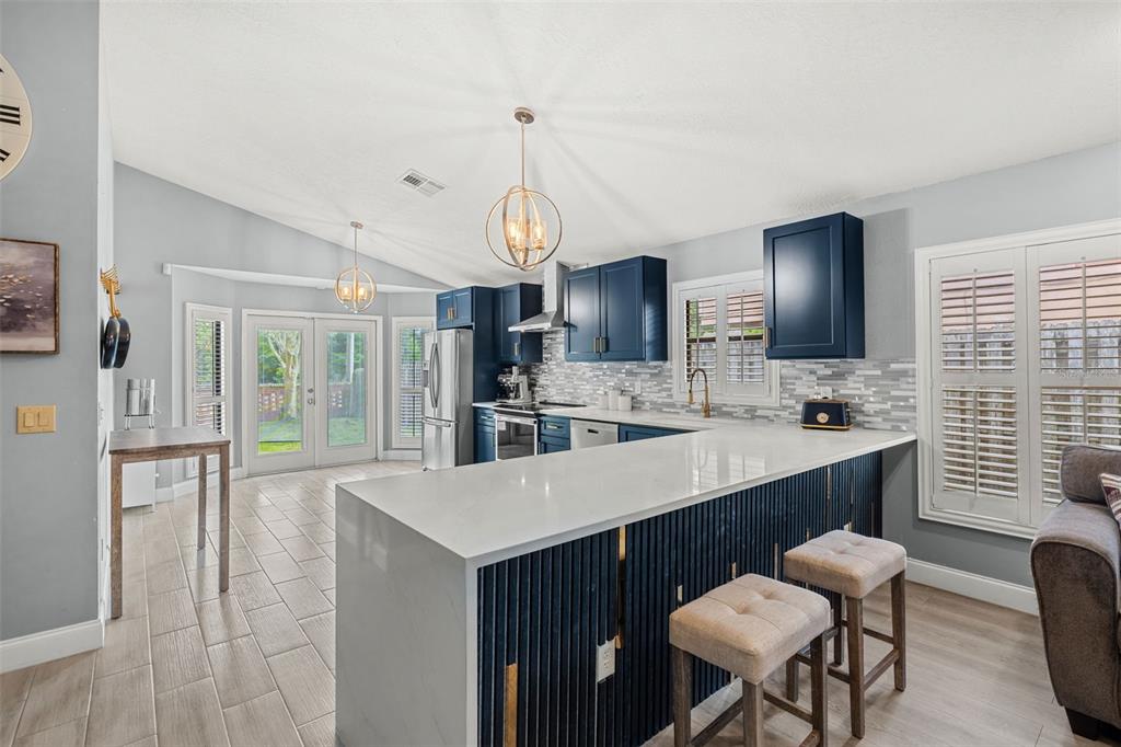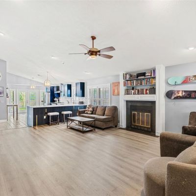 Built-in Features, Ceiling Fan(s), Eating Space In Kitchen, High Ceilings, Kitchen/Family Room Combo, Living Room/Dining Room Combo, Open Floorplan, Primary Bedroom Main Floor, Skylight(s), Solid Wood Cabinets, Stone Counters, Vaulted Ceiling(s), Walk-In Closet(s), Window Treatments