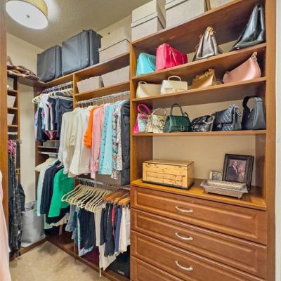 Ceiling Fan(s), Crown Molding, High Ceilings, Primary Bedroom Main Floor, Solid Wood Cabinets, Stone Counters, Thermostat, Walk-In Closet(s)