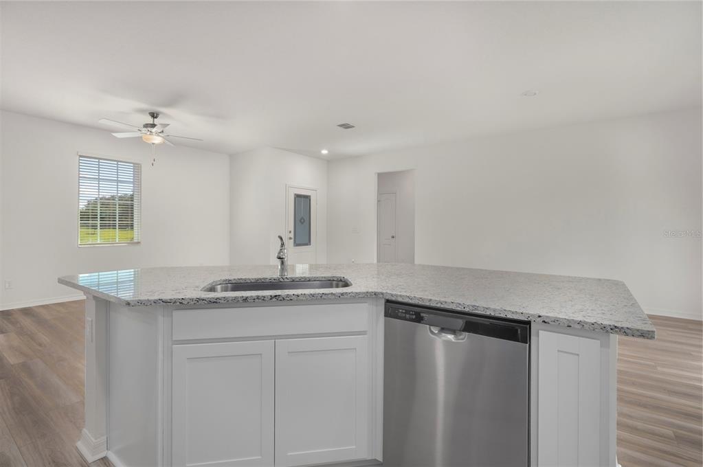 Attic Fan, Ceiling Fan(s), High Ceilings, Kitchen/Family Room Combo, Open Floorplan, Pest Guard System, Primary Bedroom Main Floor, Solid Wood Cabinets, Stone Counters, Thermostat, Walk-In Closet(s), Window Treatments