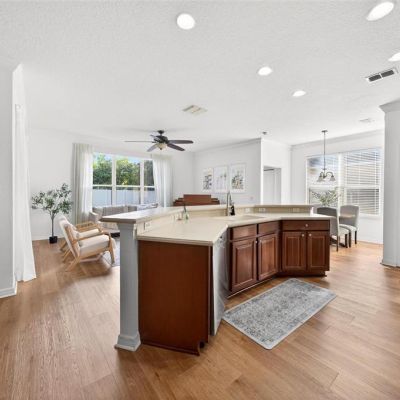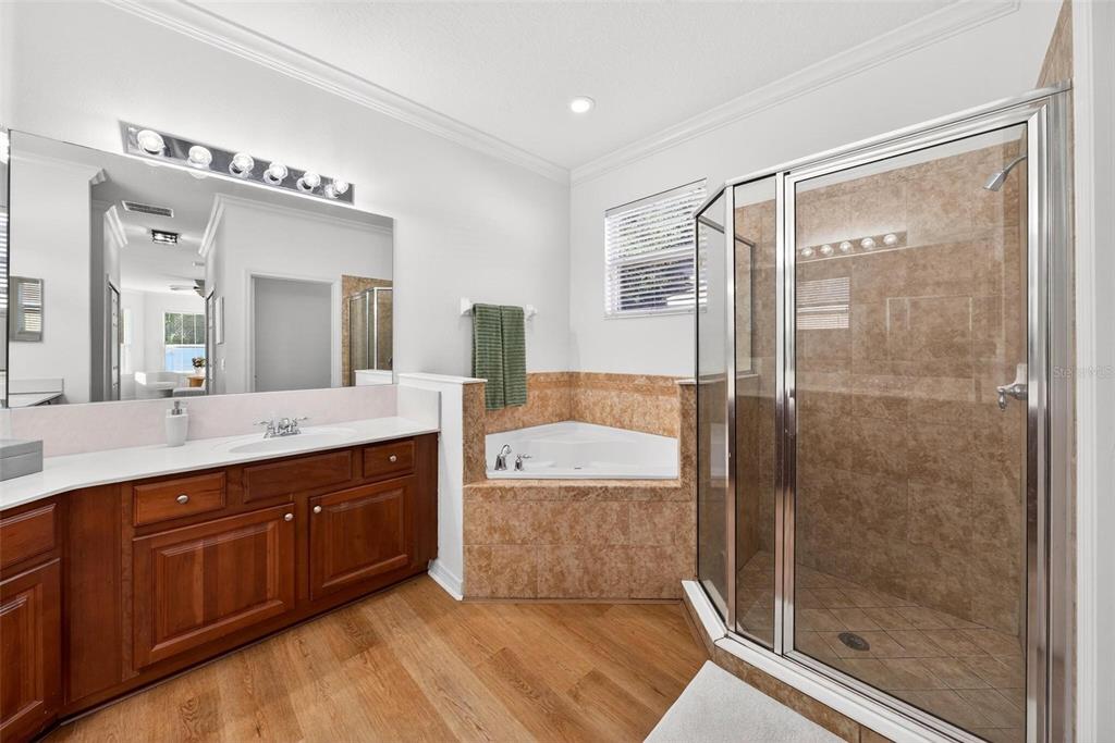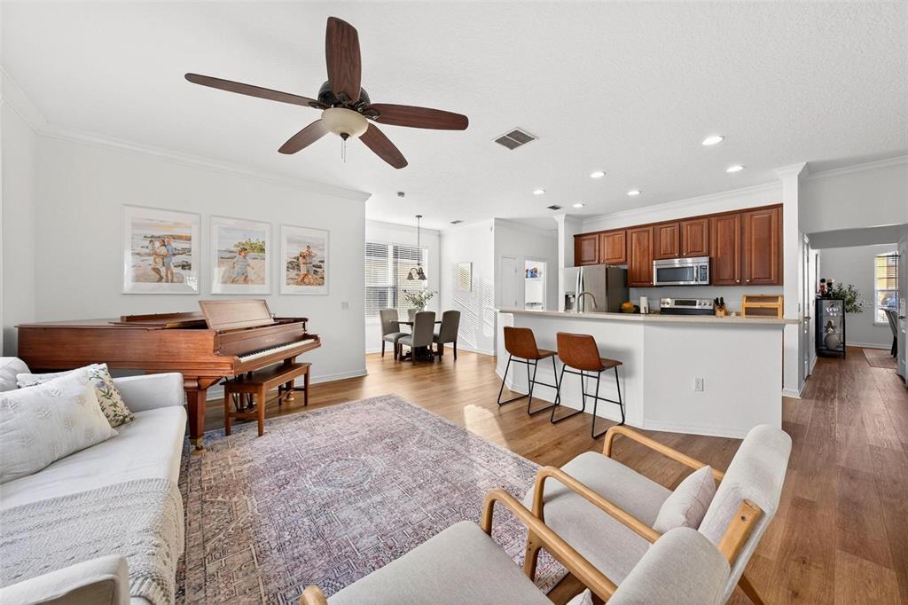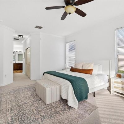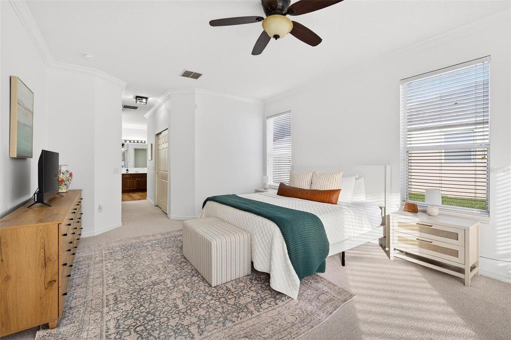 Ceiling Fan(s), Crown Molding, Eating Space In Kitchen, High Ceilings, Open Floorplan, Primary Bedroom Main Floor, Solid Wood Cabinets, Split Bedroom, Walk-In Closet(s)