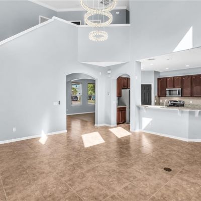 Crown Molding, Eating Space In Kitchen, High Ceilings, Kitchen/Family Room Combo, Open Floorplan, PrimaryBedroom Upstairs, Solid Surface Counters, Split Bedroom, Stone Counters, Thermostat, Walk-In Closet(s), Cathedral Ceiling(s), Ceiling Fan(s)