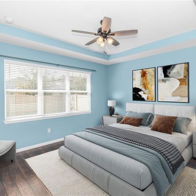 Ceiling Fan(s), Eating Space In Kitchen, High Ceilings, Kitchen/Family Room Combo, Open Floorplan, Primary Bedroom Main Floor, Solid Surface Counters, Stone Counters, Thermostat, Tray Ceiling(s), Walk-In Closet(s)