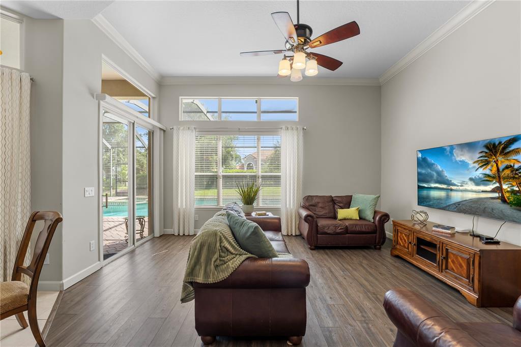Ceiling Fan(s), Crown Molding, Eating Space In Kitchen, High Ceilings, Kitchen/Family Room Combo, Living Room/Dining Room Combo, Primary Bedroom Main Floor, Solid Wood Cabinets, Stone Counters, Thermostat, Tray Ceiling(s), Walk-In Closet(s), Window Treatments