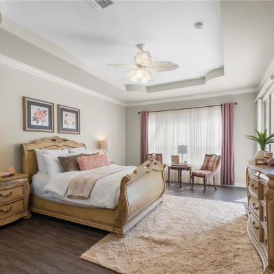 Ceiling Fan(s), Crown Molding, Eating Space In Kitchen, High Ceilings, Kitchen/Family Room Combo, Living Room/Dining Room Combo, Primary Bedroom Main Floor, Solid Wood Cabinets, Stone Counters, Thermostat, Tray Ceiling(s), Walk-In Closet(s), Window Treatments