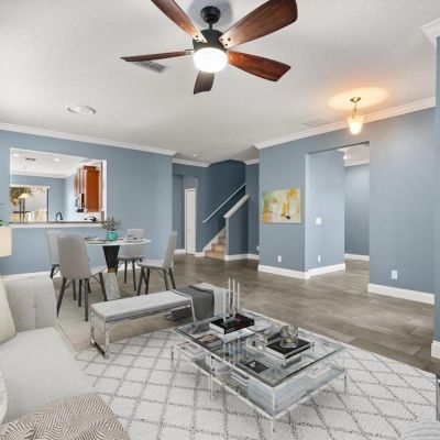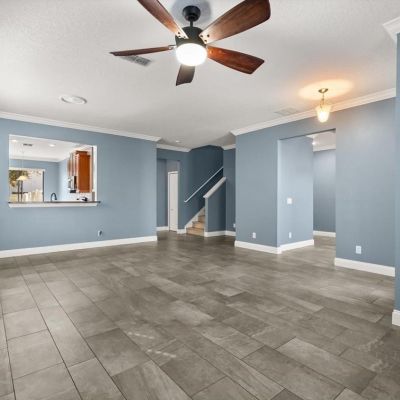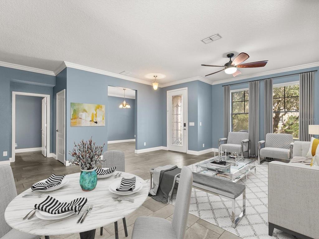 Ceiling Fan(s), Crown Molding, Eating Space In Kitchen, High Ceilings, Open Floorplan, PrimaryBedroom Upstairs, Solid Wood Cabinets, Stone Counters, Thermostat, Walk-In Closet(s)