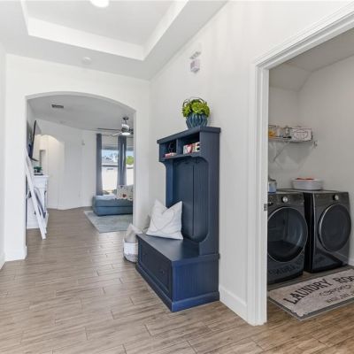 Ceiling Fan(s), High Ceilings, Kitchen/Family Room Combo, Open Floorplan, Solid Surface Counters, Solid Wood Cabinets, Split Bedroom, Stone Counters, Thermostat, Walk-In Closet(s)