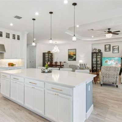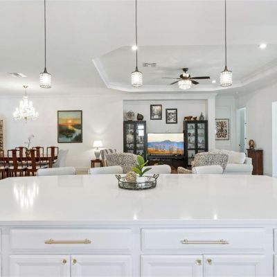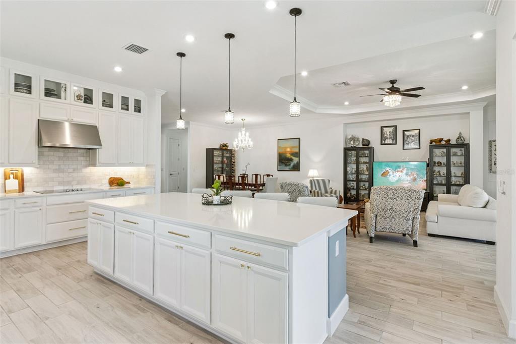 Ceiling Fan(s), Coffered Ceiling(s), Crown Molding, Kitchen/Family Room Combo, Living Room/Dining Room Combo, Open Floorplan, Primary Bedroom Main Floor, Solid Surface Counters, Stone Counters, Thermostat, Tray Ceiling(s), Walk-In Closet(s), Window Treatments