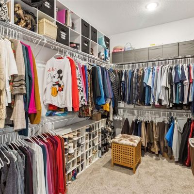 Ceiling Fan(s), Coffered Ceiling(s), Crown Molding, Kitchen/Family Room Combo, Living Room/Dining Room Combo, Open Floorplan, Primary Bedroom Main Floor, Solid Surface Counters, Stone Counters, Thermostat, Tray Ceiling(s), Walk-In Closet(s), Window Treatments