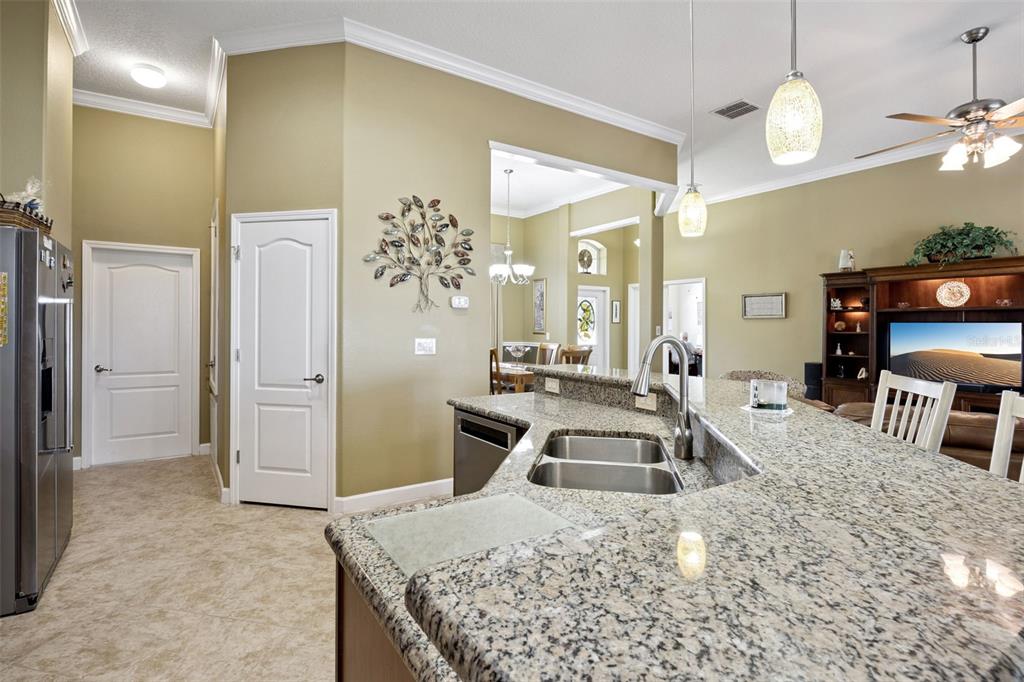 Ceiling Fan(s), Chair Rail, Crown Molding, Eating Space In Kitchen, Kitchen/Family Room Combo, Open Floorplan, Primary Bedroom Main Floor, Split Bedroom, Stone Counters, Thermostat, Walk-In Closet(s)