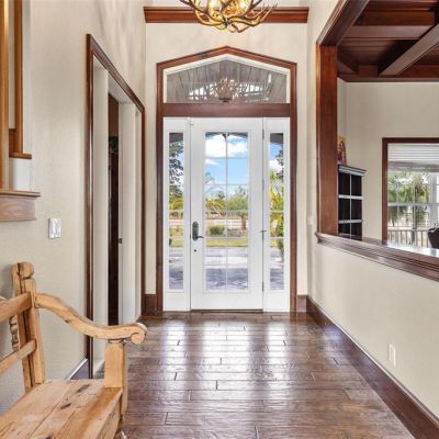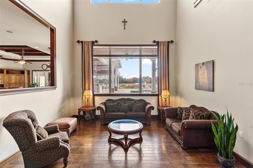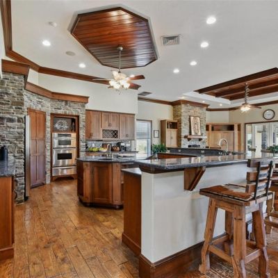 Built-in Features, Cathedral Ceiling(s), Ceiling Fan(s), Central Vacuum, Coffered Ceiling(s), Crown Molding, Eating Space In Kitchen, High Ceilings, In Wall Pest System, Kitchen/Family Room Combo, L Dining, Open Floorplan, Pest Guard System, Primary Bedroom Main Floor, Solid Wood Cabinets, Stone Counters, Thermostat, Tray Ceiling(s), Vaulted Ceiling(s), Walk-In Closet(s), Wet Bar, Window Treatments