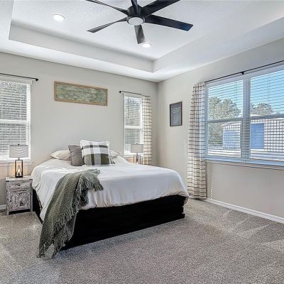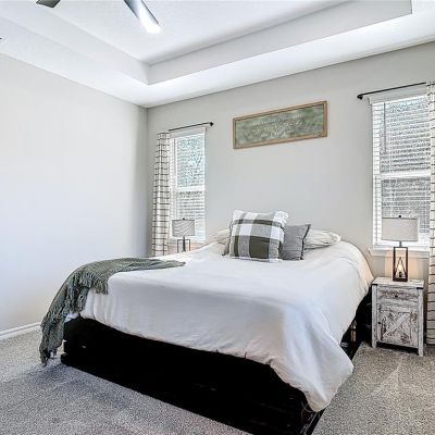 Ceiling Fan(s), High Ceilings, Kitchen/Family Room Combo, Open Floorplan, Primary Bedroom Main Floor, Solid Surface Counters, Solid Wood Cabinets, Split Bedroom, Thermostat, Tray Ceiling(s)
