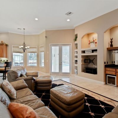 Built-in Features, Ceiling Fan(s), Chair Rail, Crown Molding, High Ceilings, Kitchen/Family Room Combo, Open Floorplan, Primary Bedroom Main Floor, Skylight(s), Split Bedroom, Stone Counters, Thermostat, Walk-In Closet(s), Wet Bar, Window Treatments