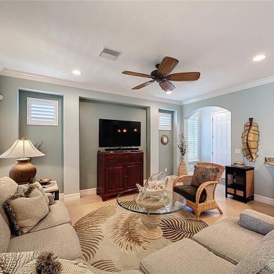 Ceiling Fan(s), Crown Molding, Eating Space In Kitchen, Living Room/Dining Room Combo, Open Floorplan, Primary Bedroom Main Floor, Solid Wood Cabinets, Split Bedroom, Stone Counters, Walk-In Closet(s), Window Treatments