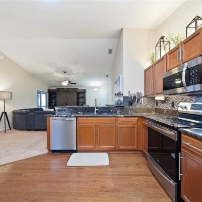 Kitchen/Family Room Combo, Open Floorplan, Primary Bedroom Main Floor, Solid Wood Cabinets, Stone Counters, Thermostat, Vaulted Ceiling(s)