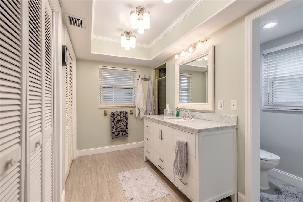 Ceiling Fan(s), Crown Molding, Primary Bedroom Main Floor, Split Bedroom, Stone Counters, Thermostat, Tray Ceiling(s), Walk-In Closet(s), Window Treatments