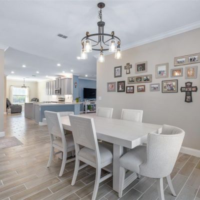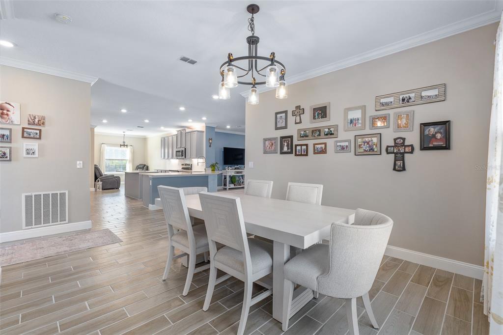 Ceiling Fan(s), Crown Molding, Eating Space In Kitchen, High Ceilings, Kitchen/Family Room Combo, L Dining, Living Room/Dining Room Combo, Open Floorplan, Pest Guard System, Primary Bedroom Main Floor, Smart Home, Solid Surface Counters, Split Bedroom, Stone Counters, Thermostat, Walk-In Closet(s), Window Treatments