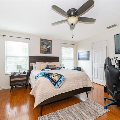 Ceiling Fan(s), Eating Space In Kitchen, High Ceilings, Kitchen/Family Room Combo, PrimaryBedroom Upstairs, Solid Surface Counters, Solid Wood Cabinets, Split Bedroom, Thermostat, Walk-In Closet(s), Window Treatments