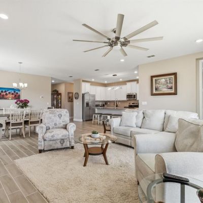 Ceiling Fan(s), High Ceilings, Kitchen/Family Room Combo, Living Room/Dining Room Combo, Open Floorplan, Primary Bedroom Main Floor, Solid Surface Counters, Solid Wood Cabinets, Split Bedroom, Thermostat, Walk-In Closet(s), Window Treatments