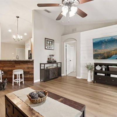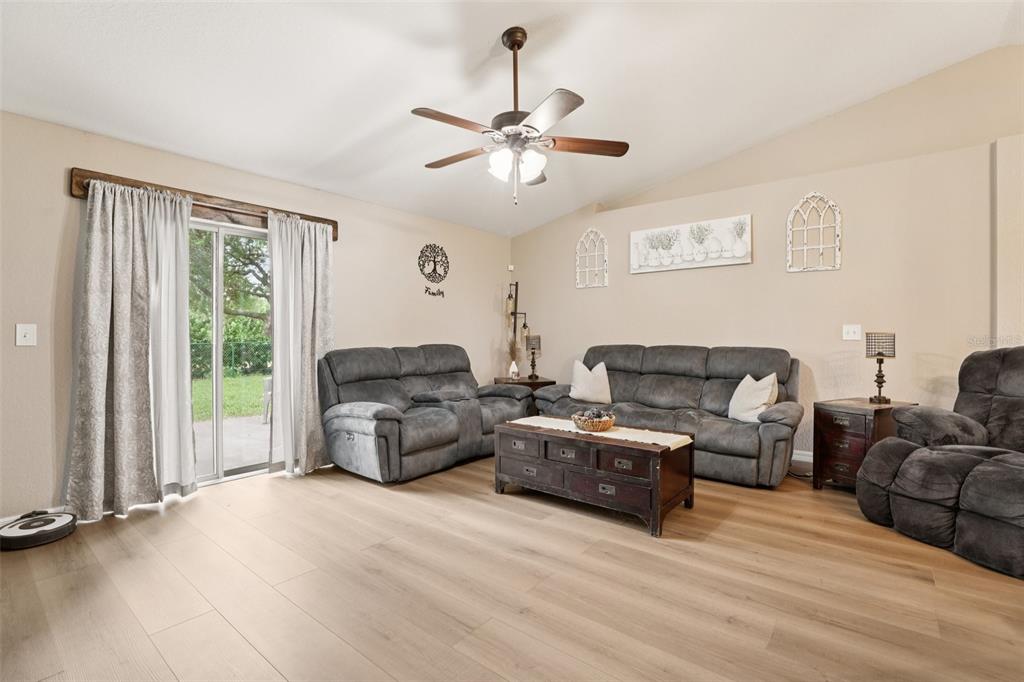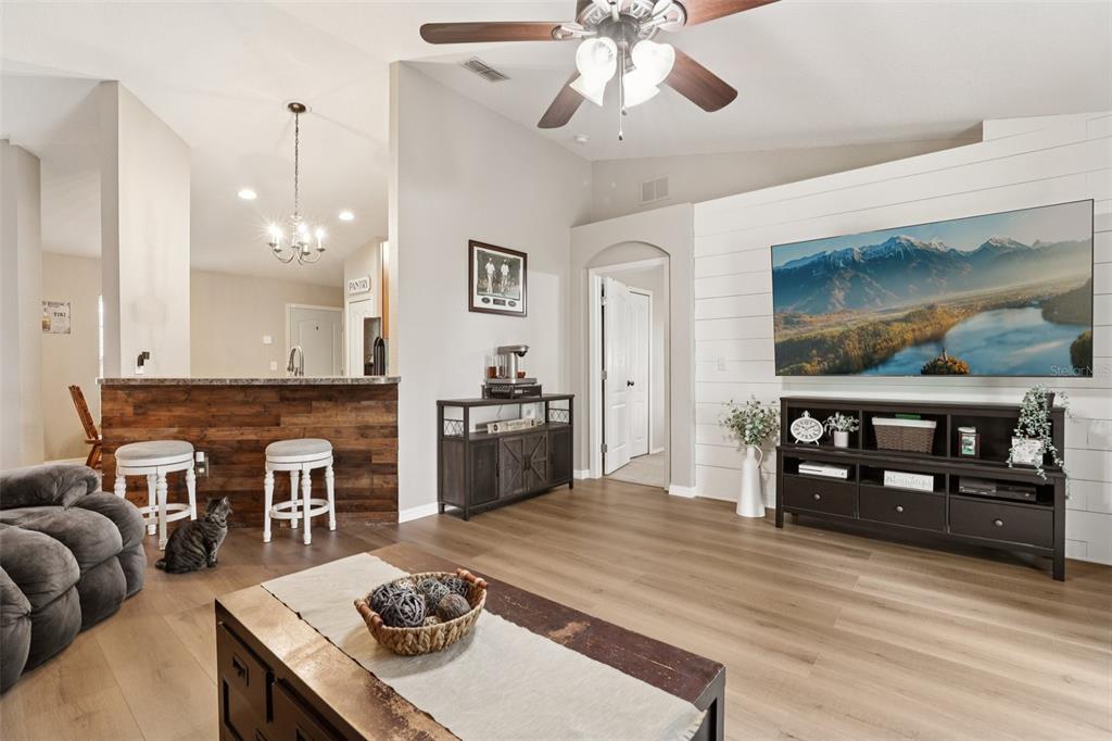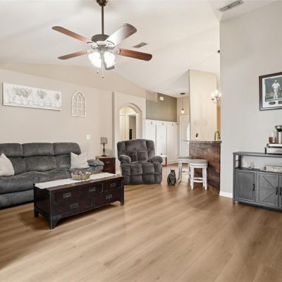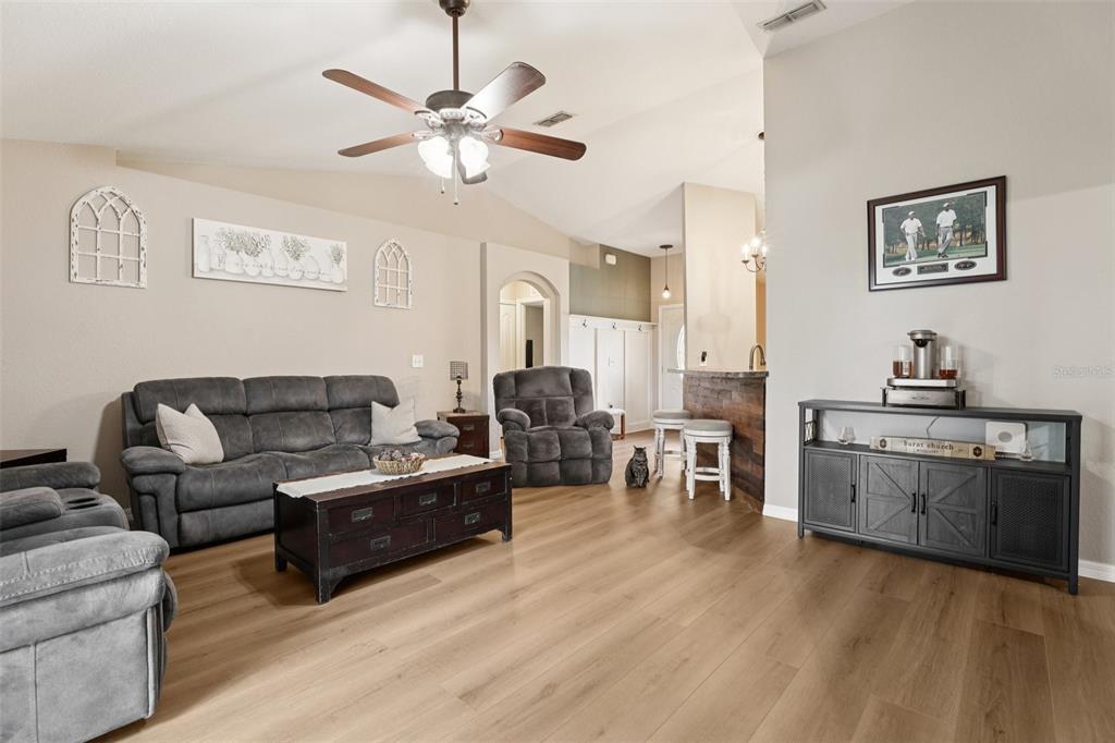 Ceiling Fan(s), Eating Space In Kitchen, High Ceilings, In Wall Pest System, Kitchen/Family Room Combo, Open Floorplan, Primary Bedroom Main Floor, Solid Surface Counters, Thermostat, Vaulted Ceiling(s), Walk-In Closet(s)