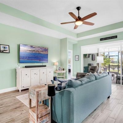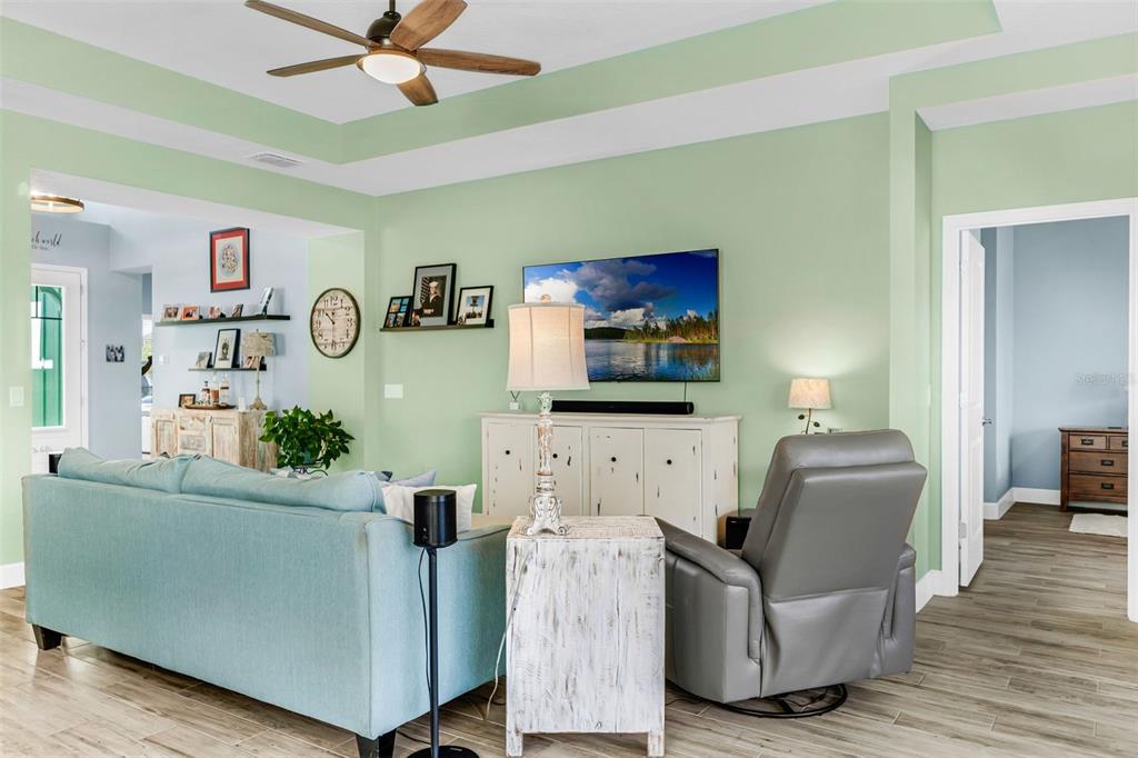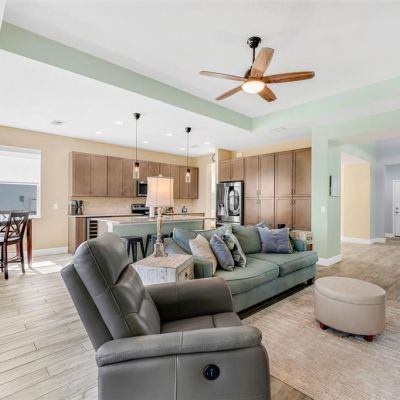 Ceiling Fan(s), Eating Space In Kitchen, High Ceilings, Kitchen/Family Room Combo, Open Floorplan, Primary Bedroom Main Floor, Solid Surface Counters, Split Bedroom, Stone Counters, Thermostat, Walk-In Closet(s)