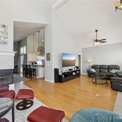 Cathedral Ceiling(s), Ceiling Fan(s), Eating Space In Kitchen, Kitchen/Family Room Combo, Living Room/Dining Room Combo, Primary Bedroom Main Floor, Split Bedroom, Stone Counters, Walk-In Closet(s), Window Treatments