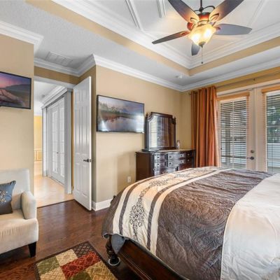 Ceiling Fan(s), Crown Molding, Dry Bar, Eating Space In Kitchen, High Ceilings, Open Floorplan, Solid Surface Counters, Solid Wood Cabinets
