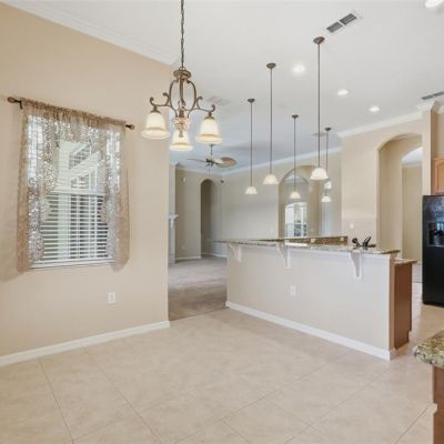 Ceiling Fan(s), Crown Molding, High Ceilings, Kitchen/Family Room Combo, Open Floorplan, Solid Surface Counters, Solid Wood Cabinets, Split Bedroom, Stone Counters, Thermostat, Tray Ceiling(s), Walk-In Closet(s), Window Treatments