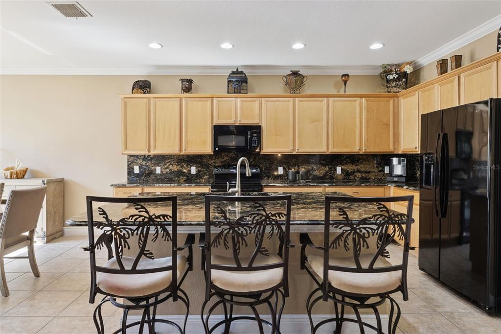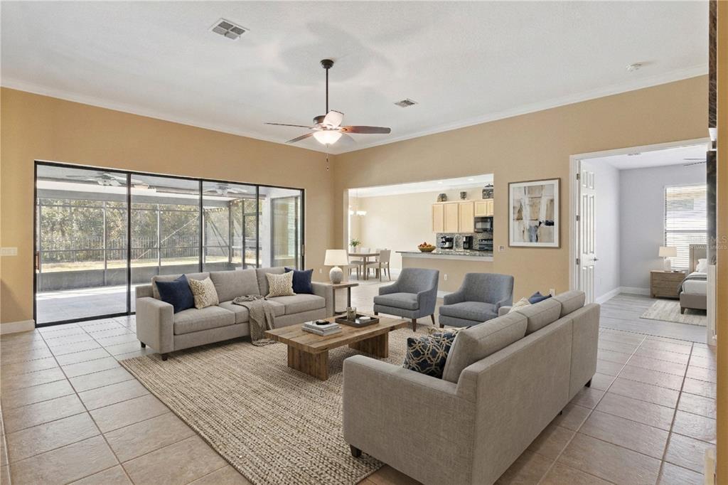 Ceiling Fan(s), Crown Molding, Kitchen/Family Room Combo, Open Floorplan, Primary Bedroom Main Floor, Solid Wood Cabinets, Stone Counters, Thermostat, Walk-In Closet(s), Window Treatments