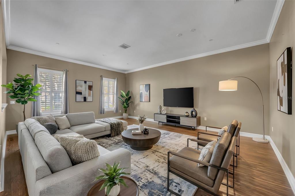 Ceiling Fan(s), Central Vacuum, Crown Molding, Eating Space In Kitchen, High Ceilings, Kitchen/Family Room Combo, Living Room/Dining Room Combo, Primary Bedroom Main Floor, Solid Wood Cabinets, Split Bedroom, Thermostat, Vaulted Ceiling(s), Walk-In Closet(s), Window Treatments