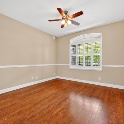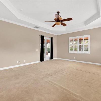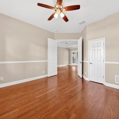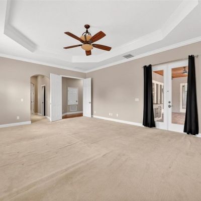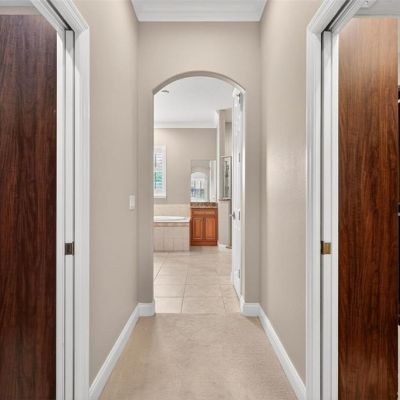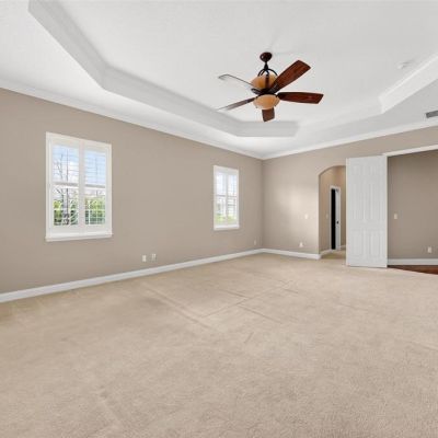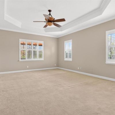 Ceiling Fan(s), Crown Molding, Dry Bar, Eating Space In Kitchen, High Ceilings, L Dining, Open Floorplan, Primary Bedroom Main Floor, PrimaryBedroom Upstairs, Solid Surface Counters, Solid Wood Cabinets, Split Bedroom, Thermostat, Walk-In Closet(s)