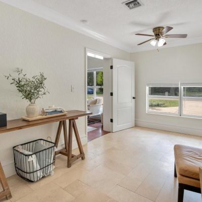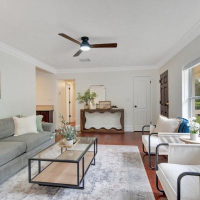 Ceiling Fan(s), Crown Molding, Primary Bedroom Main Floor, Solid Wood Cabinets, Stone Counters, Thermostat, Window Treatments
