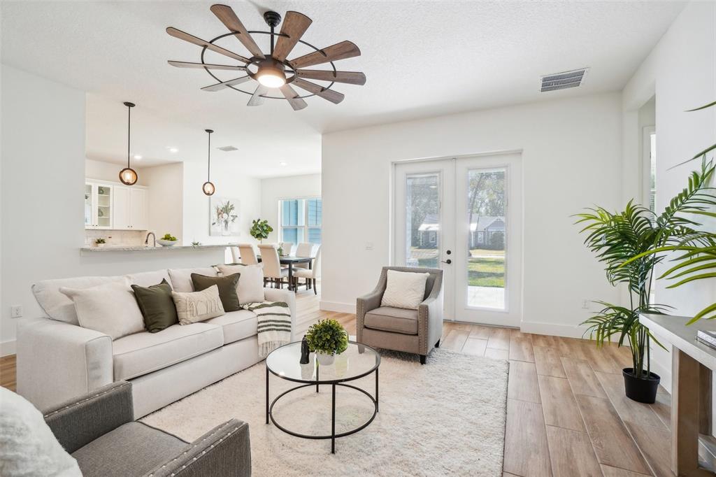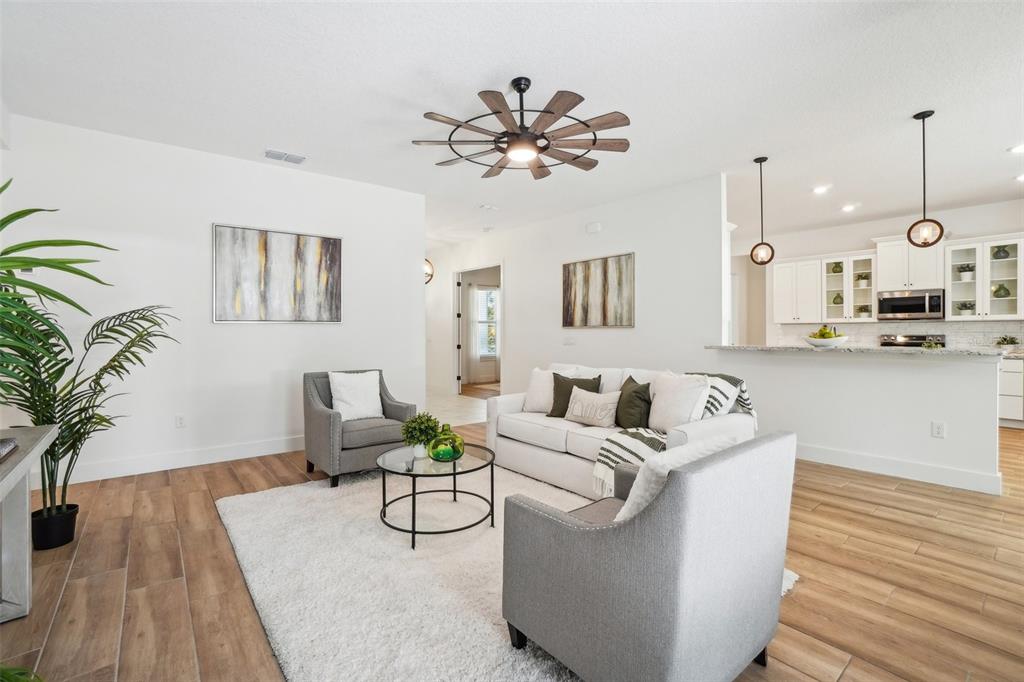 Ceiling Fan(s), Eating Space In Kitchen, Kitchen/Family Room Combo, Open Floorplan, Primary Bedroom Main Floor, Solid Surface Counters, Split Bedroom, Stone Counters, Thermostat, Walk-In Closet(s)