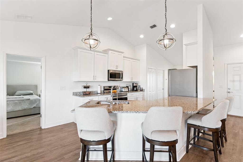 Ceiling Fan(s), Coffered Ceiling(s), Eating Space In Kitchen, Kitchen/Family Room Combo, Open Floorplan, Solid Surface Counters, Solid Wood Cabinets, Split Bedroom, Thermostat, Walk-In Closet(s)