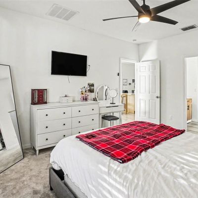 Ceiling Fan(s), Open Floorplan, Primary Bedroom Main Floor, Solid Surface Counters, Split Bedroom, Thermostat, Window Treatments
