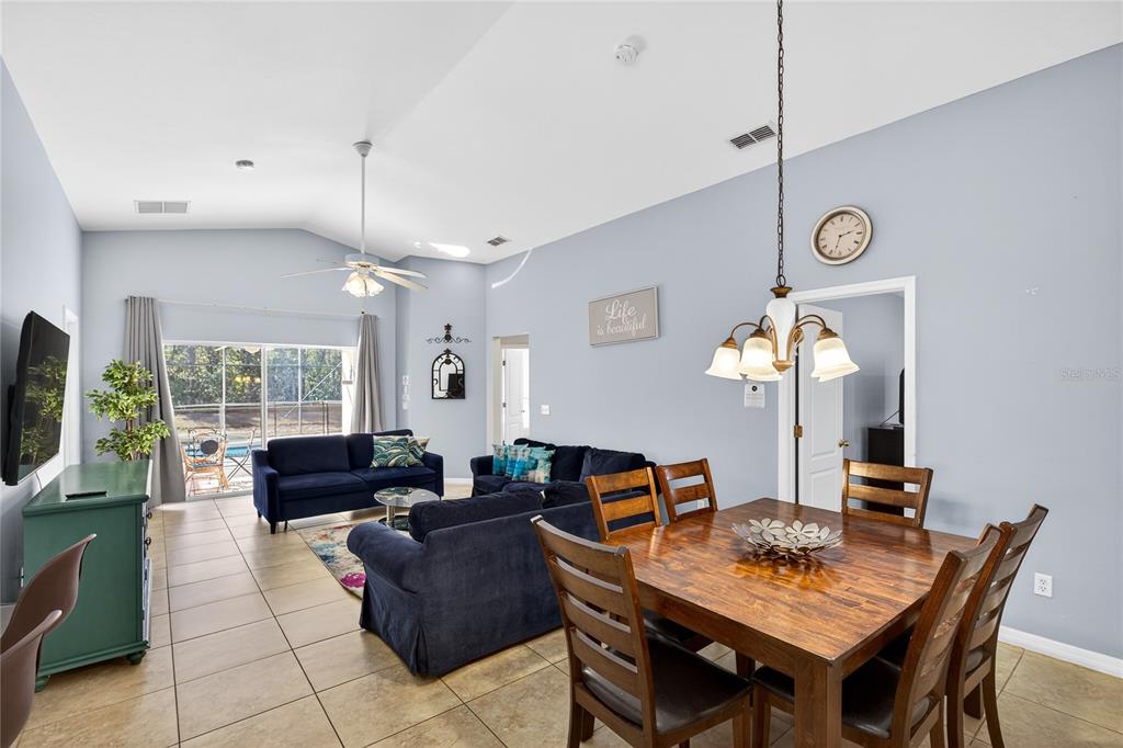 Cathedral Ceiling(s), Ceiling Fan(s), Eating Space In Kitchen, High Ceilings, Kitchen/Family Room Combo, Living Room/Dining Room Combo, Open Floorplan, Primary Bedroom Main Floor, Solid Surface Counters, Split Bedroom, Thermostat, Walk-In Closet(s), Window Treatments
