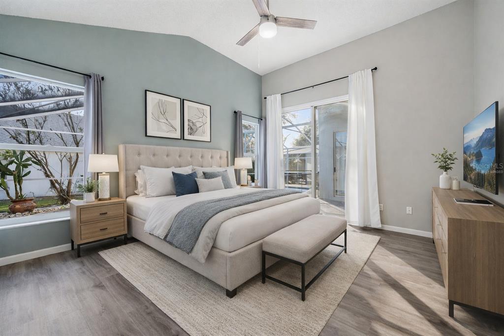 Cathedral Ceiling(s), Ceiling Fan(s), High Ceilings, Living Room/Dining Room Combo, Open Floorplan, Primary Bedroom Main Floor, Solid Surface Counters, Solid Wood Cabinets, Split Bedroom, Stone Counters, Thermostat, Walk-In Closet(s), Window Treatments