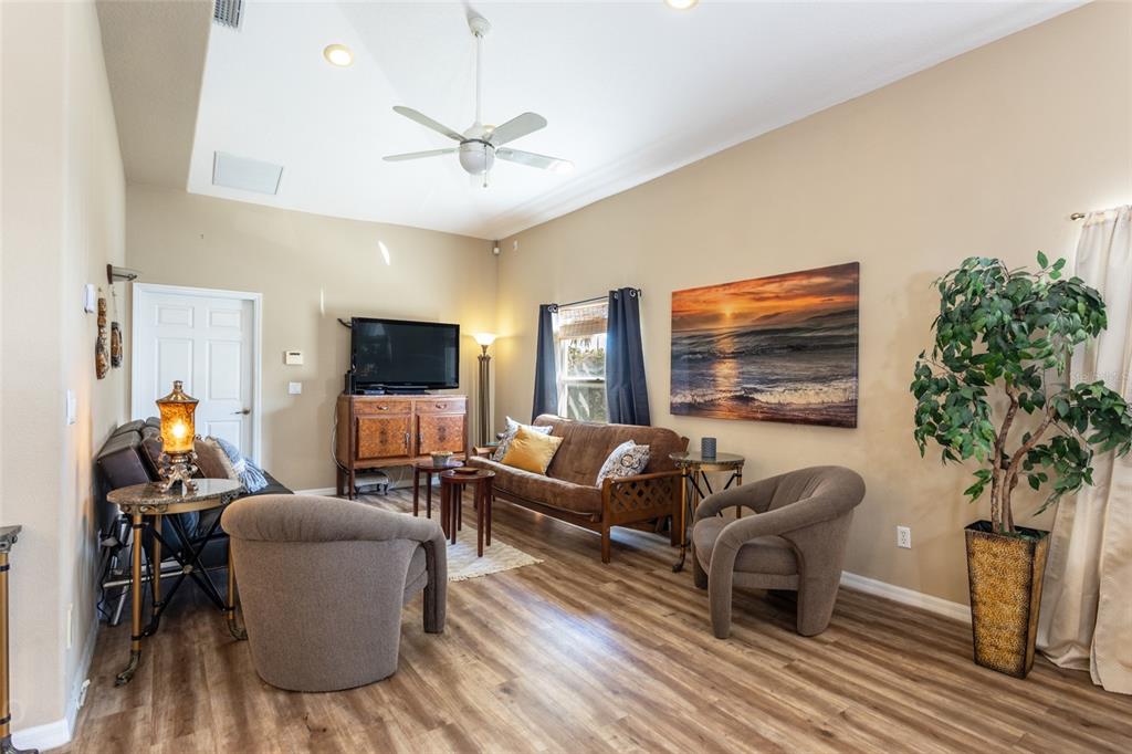 Built-in Features, Ceiling Fan(s), Eating Space In Kitchen, High Ceilings, Kitchen/Family Room Combo, Living Room/Dining Room Combo, Open Floorplan, Solid Surface Counters, Split Bedroom, Vaulted Ceiling(s), Walk-In Closet(s), Window Treatments